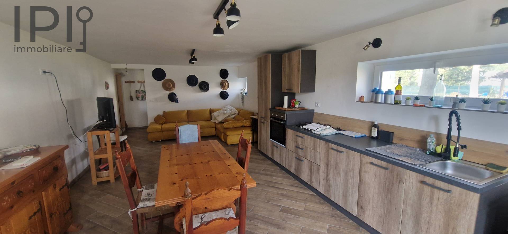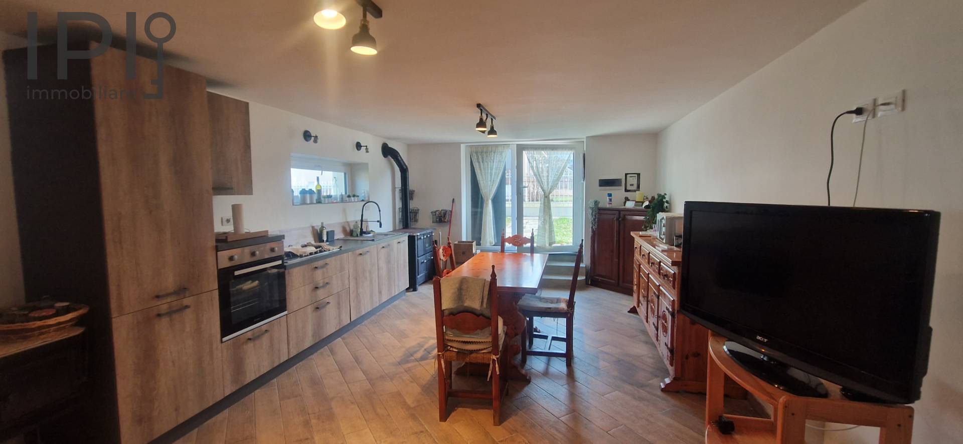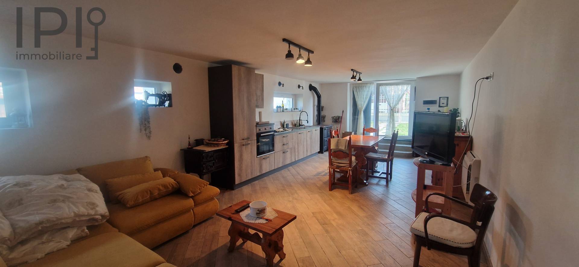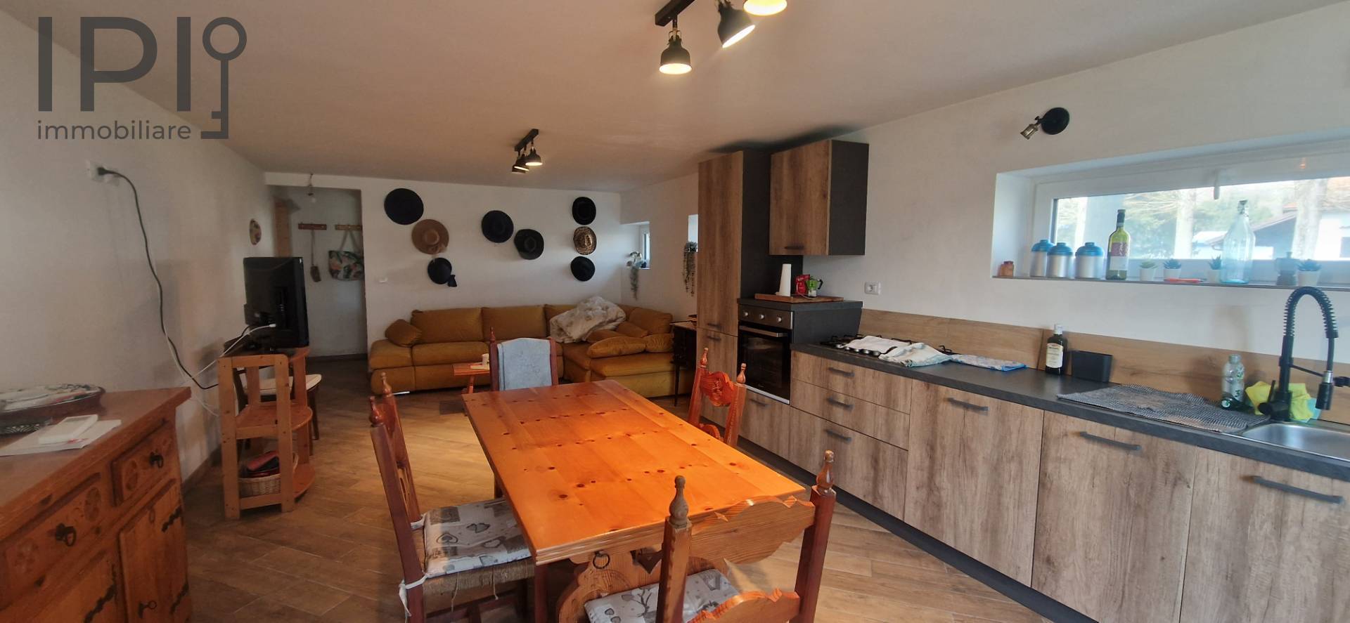 Im Erdgeschoss befindet sich ein großer Wohnbereich mit offener Küche, ideal für gesellige Abende, ergänzt durch ein Badezimmer und einen funktionalen Keller-/Abstellraum.