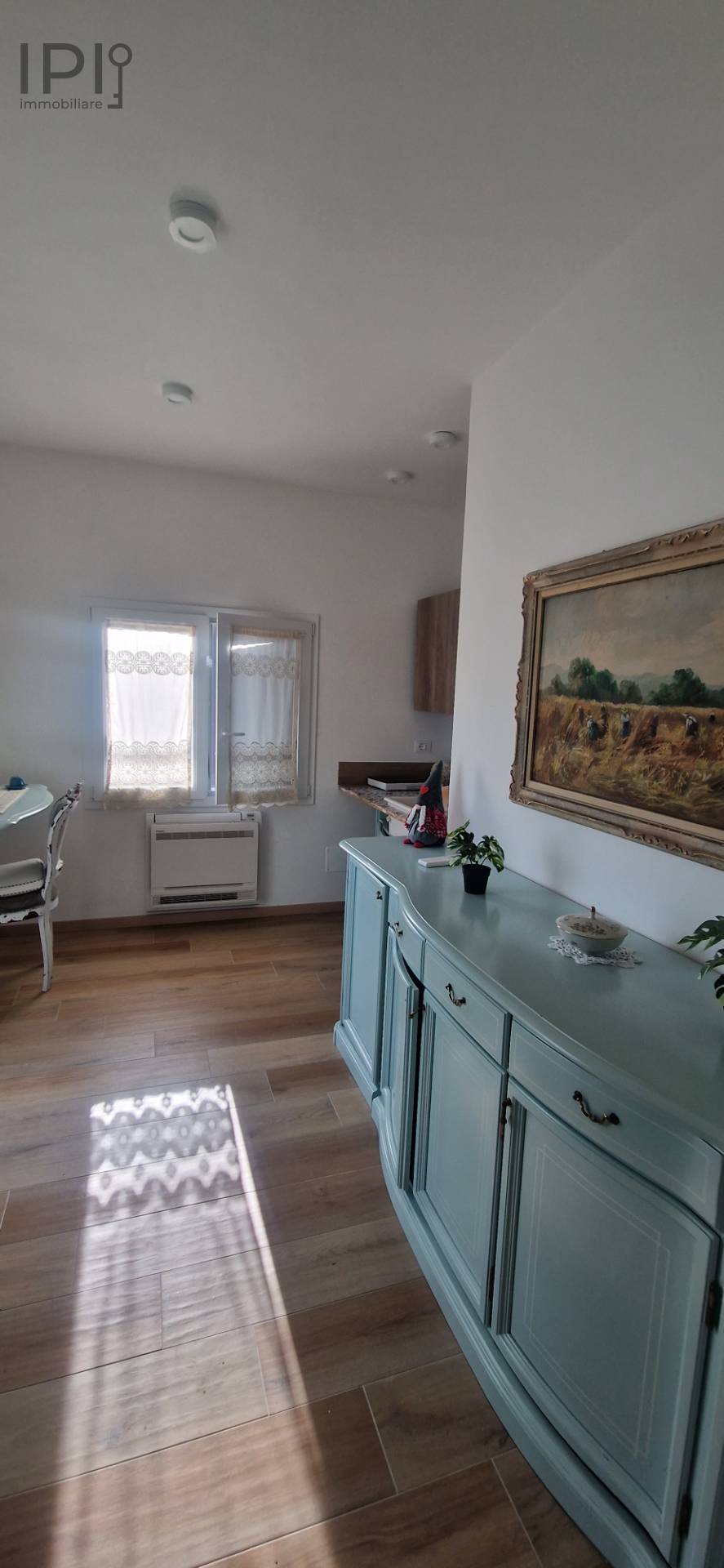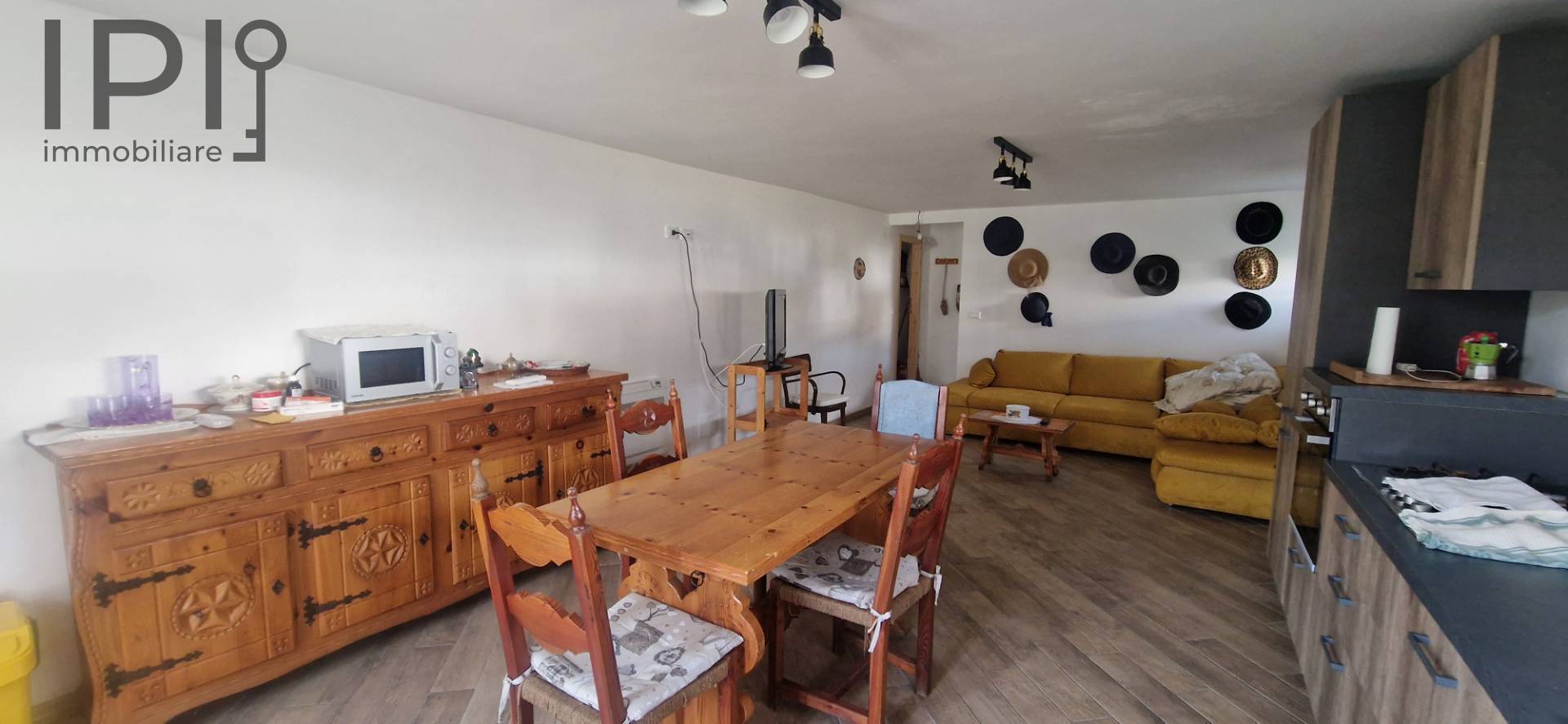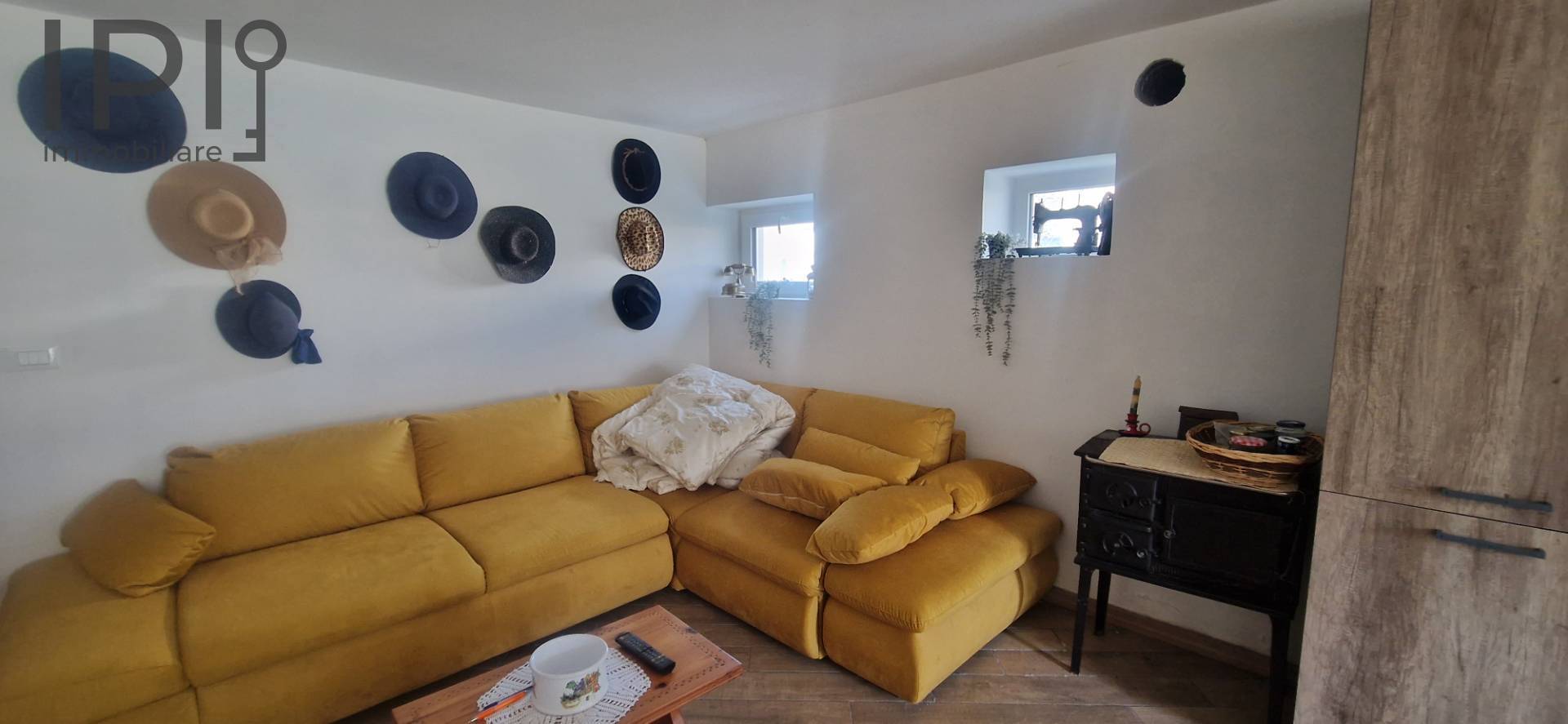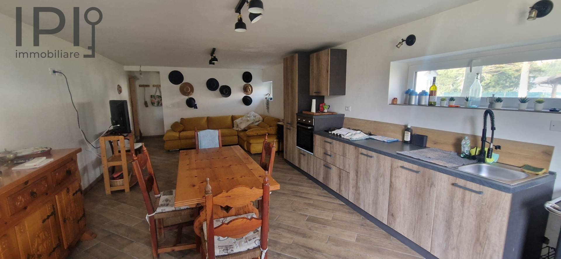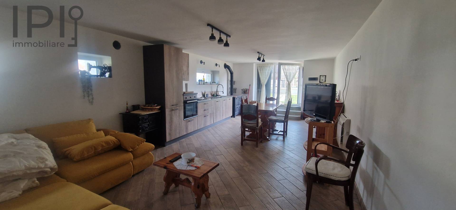 Im Erdgeschoss befindet sich ein großer Wohnbereich mit offener Küche, ideal für gesellige Abende, ergänzt durch ein Badezimmer und einen funktionalen Keller-/Abstellraum.